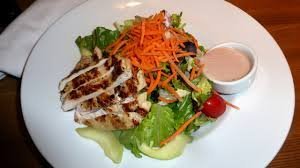 4. Tányérra tesszük a jégsalátát és a koktélparadicsomot, ráhalmozzuk az uborkát és a sárgarépát, majd meglocsoljuk az öntettel. Erre tesszük a frissen sütött húst ,és az egészet megszórjuk a kenyérkockákkal.