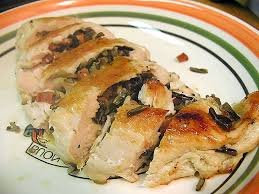 - A csirkemell szeleteket megtöltjük a gombás töltelékkel (az oldalát hústűvel összetűzhetjük, hogy ne folyjon ki a töltelék), és betesszük egy tepsibe. A tetejére bacon szalonnát teszünk, hogy ne száradjon ki sütés közben.